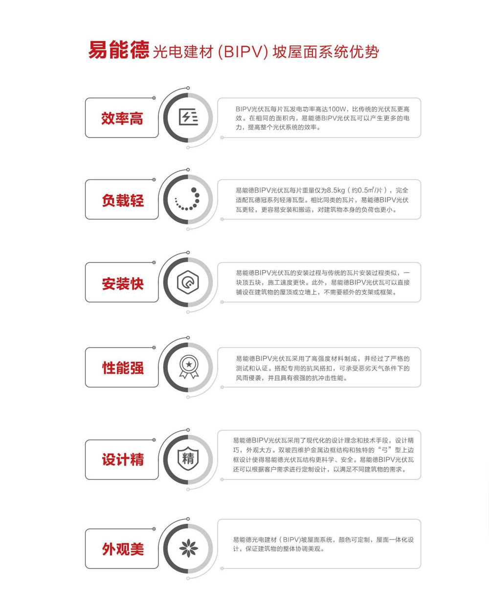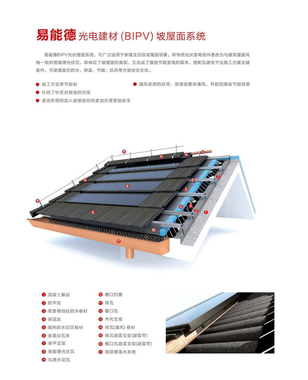 瓦德新材始終秉承著“雙碳經(jīng)濟綠色發(fā)展”的目標和理念。提出了“屋面系統(tǒng)一體化”的理論,以產(chǎn)品屬性為依據(jù)進行系統(tǒng)化設(shè)計,致力于實現(xiàn)“通風(fēng)屋面”、“節(jié)能屋面”和“零碳屋面”的目標,受到廣泛認可和應(yīng)用。并且,發(fā)揮自身的“產(chǎn)業(yè)優(yōu)勢、創(chuàng)新優(yōu)勢、品牌優(yōu)勢、市場優(yōu)勢”,與光伏產(chǎn)業(yè)的頭部企業(yè)合作,共同開發(fā)出易能德光伏與建筑一體化(BIPV)系列產(chǎn)品,以推動綠色節(jié)能建材行業(yè)的可持續(xù)發(fā)展。